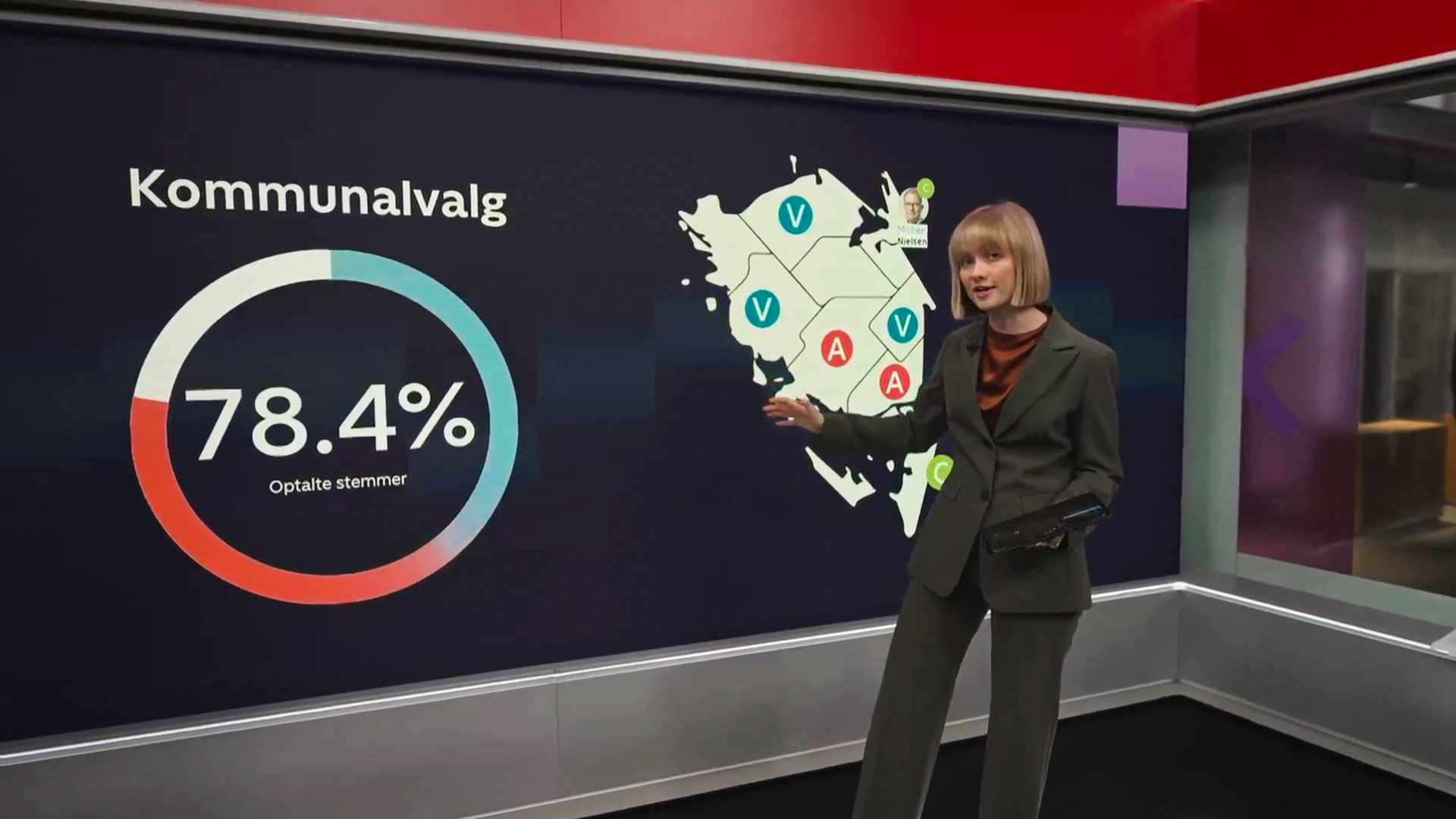 En tredje opgave jeg havde under kommunalvalget var, at lave designet til vores resultatformidling på TV. Her udarbejdede jeg en lang række skærme som ved hjælp af et API blev liveopdateret med det seneste nye data ift. optælling af stemmer, fordeling af mandater osv.